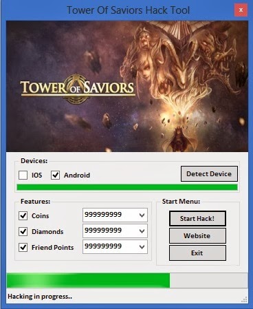1. Connect your iOS or Android device to computer using USB. 2. Run [Tower Of Saviors Hack] 3. Click the [Detect Device] button. 4. Complete items amount you want to generate! (Choose and turn on from the Hack Tool Features) 5. Press [Start Hack] button to start adding the items to your game app. 6. Enjoy!